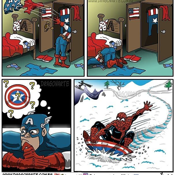 We would love to get a chance to go sledding on Captain America’s shield. Spiderman should have at least asked permission first, don’t you think? We can’t help but notice Batman skiing in the background. He seems to love showing up in the background of everyone’s lives.
